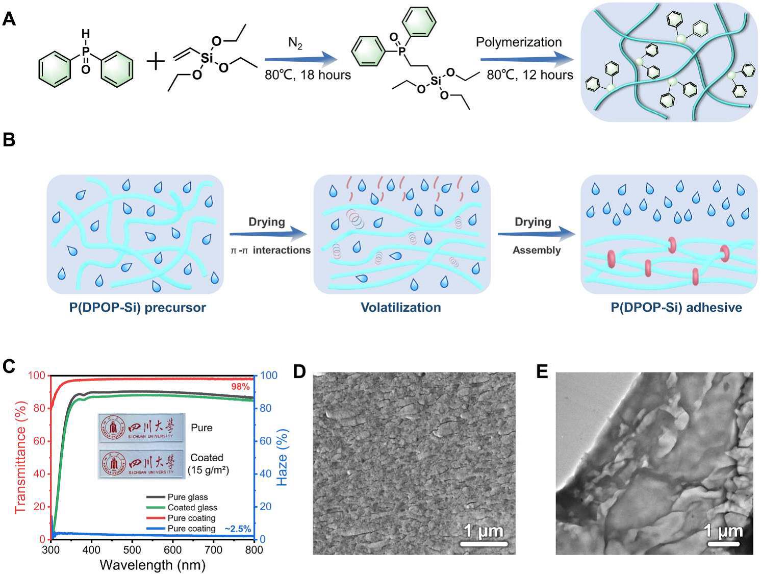 汪秀丽/赵海波教授团队报道了一种可以完全回收利用的多功能黏合剂,其特点是具有高耐久性、高透明性和优异的阻燃性,并且可耐多种苛刻环境。该工作所设计的芳香硅氧烷黏合剂可以通过π-π堆叠作用驱动其本身发生可逆组装过程。在乙醇挥发过程中,黏合剂分子内部形成有序的分层组装结构,从而产生高透光率(~98%)、低雾度(~2.5%)以及强大的内聚能。对水不敏感的硅氧烷黏合剂在各种材料上表现出强大而持久的黏附力(高达3.5 MPa),即使在高湿度(85% RH)、水下、盐和强酸/碱溶液(pH 1-14)以及低/高温(-10-90 ℃)等恶劣条件下也能实现长期稳定的强黏附性能。尤其可贵的是,通过可逆组装/解组装,该黏合剂可以实现完全闭环回收(~100%),且重复使用超过100次而不损失其黏附性能。此外,结合其本身具有的高阻燃性,该黏合剂可直接用作高耐久的保护性涂层,在诸多具体应用中表现出独特的优势。
