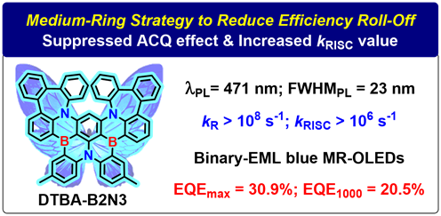 游劲松教授和宾正杨教授团队发展了一种“中环”策略以抑制MR-TADF分子堆积,并进一步提高MR-TADF分子的kRISC。在保持窄发光半峰宽的前提下,该团队成功发展了一种兼具高kRISC(>106 s-1)和高kR(>108 s-1)的蓝光MR-TADF分子DTBA-B2N3,有效抑制分子聚集产生的光谱展宽和发光淬灭,从而获得高效率和低效率滚降的蓝光窄光谱OLED。