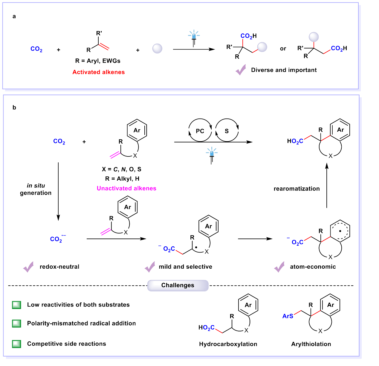 另一方面,太阳能是取之不尽用之不竭的清洁能源。可见光催化将光能转化为化学能,促进化学反应,具有绿色环保、条件温和等优点,因此备受关注。近年来,人们利用可见光催化CO2参与烯烃的官能团化羧基化反应,构建了一系列结构多样、高度官能团化的羧酸及其衍生物。然而,在已报道的例子中,底物主要局限于活化烯烃(例如芳基烯烃和丙烯酸酯)。相比而言,非活化烯烃反应性更低,更难与CO2发生羧基化反应。CO2与非活化烯烃相比,能够优先被还原,产生高活性CO2自由基负离子。然而,CO2自由基负离子是亲核性的自由基物种,对富电子非活化烯烃的加成属于极性不匹配过程,且涉及的自由基中间体还可能发生多种副反应。因此,CO2参与非活化烯烃的双官能团化反应面临着巨大的挑战。