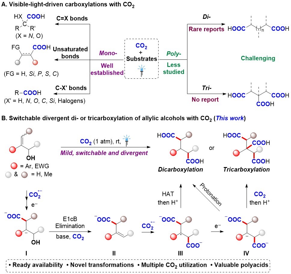 二氧化碳(CO2)作为一种储量丰富、无毒且可循环再生的碳资源,其高效利用对于推动可持续发展具有重要意义。通过化学转化将CO2转化为高附加值化学品是实现CO2资源化利用的重要途径之一。在众多转化方法中,可见光催化CO2的羧基化反应可以绿色精准地合成高附加值羧酸分子,因此备受瞩目。然而,当前可见光催化CO2的羧基化领域主要局限于单羧基化反应,仅有少量双羧基化报道,还没有三羧基化反应的报道。鉴于多元羧酸作为关键的聚合单体和交联剂在高分子材料领域的广泛用途,开发CO2参与的多重羧基化反应,高效高选择性合成多元羧酸,具有重要的科学意义和实际应用价值。