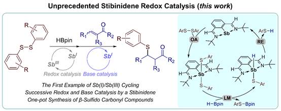 新型催化体系的开发与应用能够为催化研究提供新思路、新方法,从而促进催化化学的发展。变价催化循环是过渡金属催化中的主流反应模式。而主族元素化合物参与的氧化还原反应一般不可逆,因此通常难以构建变价催化循环。但是,近十多年以来,以有机膦催化为代表的主族变价催化取得了突破性进展,实现了多种多样的有机转化,为催化化学开辟了新的研究领域。锑是第五主族重金属元素,其+3价化合物比较稳定。而+1价锑化合物锑宾(Stibinidene)由于具有低价态金属中心,容易发生不可逆的氧化反应,这为其变价催化体系的构建带来了巨大的挑战。