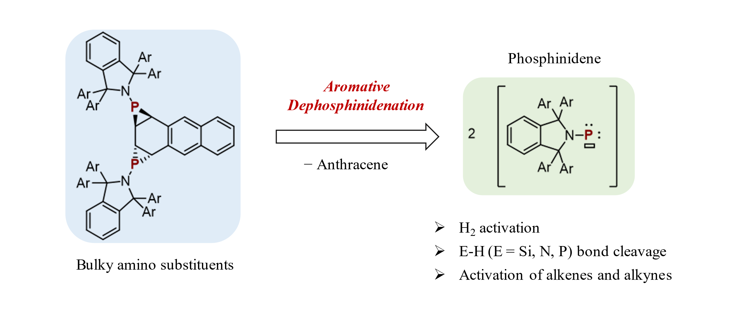 卢伟课题组报道了一例双磷杂环丙烷并蒽衍生物的合成,该化合物可看成是胺基膦宾中间体与蒽发生[1+2]环加成反应的产物。在加热条件下发生去膦宾芳构化(逆环加成)反应生成蒽和二分子膦宾中间体,该膦宾中间体可迅速发生分子内异构化。此外研究表明,该化合物可作为胺基膦宾转移试剂活化氢气(H2)和元素-氢键(P-H,Si-H和N-H),以及与烯烃和炔烃等不饱和键发生[1+2]环加成反应,构建多种磷杂环化合物。该工作中,卢伟课题组成功合成了双磷杂环丙烷并蒽衍生物,该化合物可作为新型膦宾转移试剂活化多种小分子,并构建一系列含磷化合物。