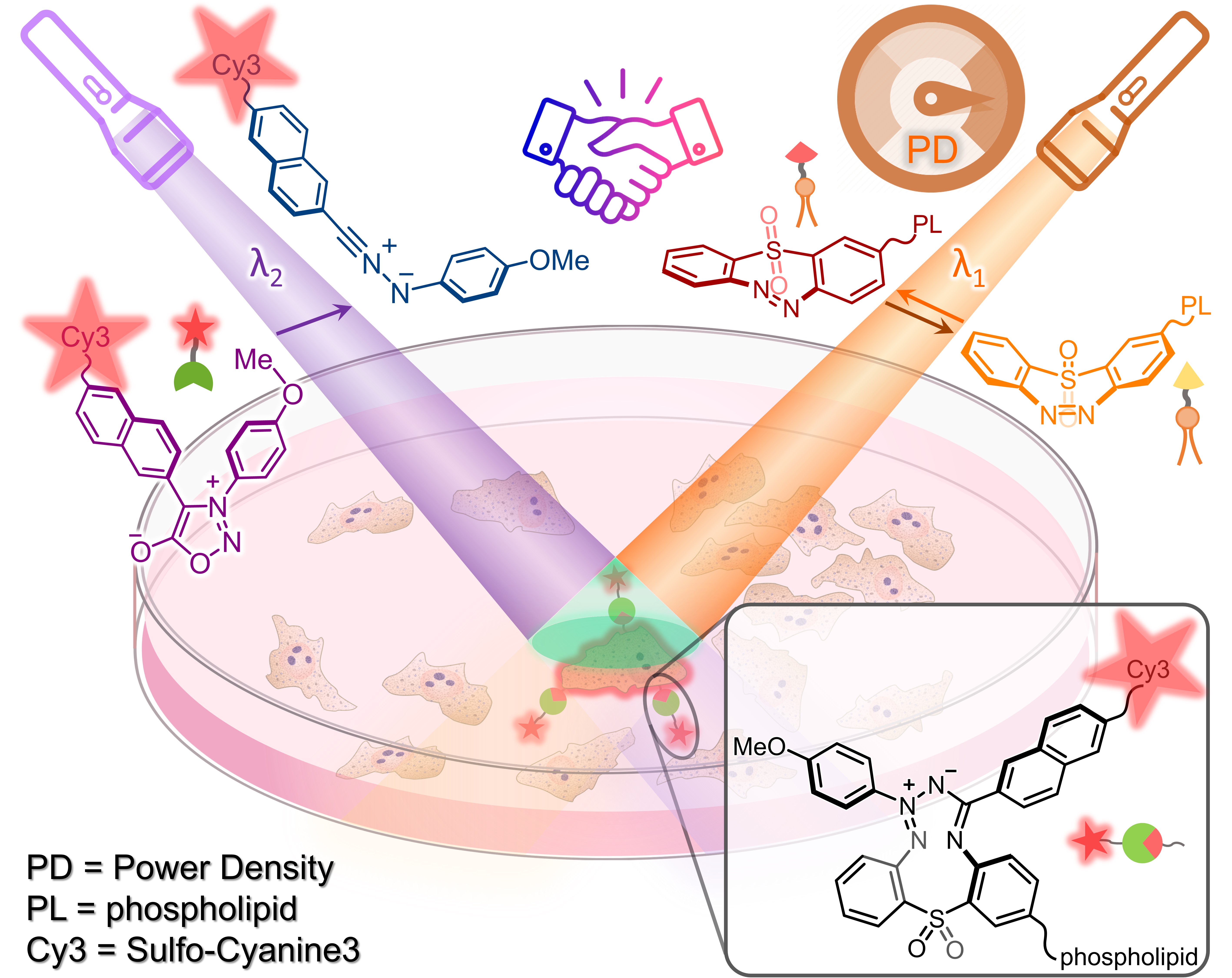 图1. 细胞膜上双波长相交光控制的光点击标记概念图。