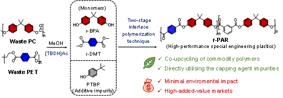 张帆教授和张刚研究员团队合作,创新开发了一种废弃PC与PET的协同回收与升级转化技术,成功制备出高性能透明工程塑料聚芳酯(PAR)。研究首先采用[TBDH]Ac离子液体催化剂体系,在相对温和条件下通过甲醇解反应,将各类废旧PC塑料和PET塑料/织物转化为纯度98%的双酚A(BPA)和99%的对苯二甲酸二甲酯(DMT)。与传统的通过额外纯化工艺来制备高纯度单体以进行再聚合的方法不同,本研究进一步开发出两阶段可控变温界面聚合技术,将回收的单体直接制备再生PAR(r-PAR),最大程度地减少了残留杂质对再聚合的不利影响。与商用PAR产品(U-100)相比,r-PAR具有出色的热稳定性、较高的机械强度和更好的熔体流动性。该技术已实现公斤级放大生产,可用于制备具有优异透明度、柔韧性、透光性和阻燃性的PAR薄膜材料。生命周期评估证实,新工艺相对于目前传统的废弃高分子处理方法,可显著降低全球升温潜能值(至少降低26%)以及淡水生态毒性和人体毒性方面的环境影响。这项研究极大简化了废弃PET和PC的化学循环和升级回收过程,从而降低了能耗并实现了利用废弃商品聚合物大规模工业化生产高性能特种工程塑料。