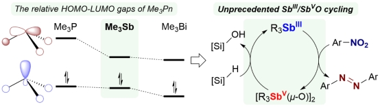 周吉亮课题组聚焦于主族金属锑(Sb)的变价催化研究,已经报道了以低价有机锑化合物为催化剂的SbI/SbIII变价催化体系的开发与应用(J. Am. Chem. Soc. 2024, 146, 20432)。最近,他们通过理论研究发现,Me3Sb在其同系物中具有最小的HOMO-LUMO能隙,表明了其最强的双亲性,这赋予其良好的反应活性。Me3Sb可以还原硝基芳烃生成氧化偶氮芳烃和偶氮芳烃,自身被氧化。而锑氧化物可以被硅烷还原再生Me3Sb。基于此,该工作实现了Me3Sb催化的硝基芳烃的还原反应,代表了首例SbIII/SbVO催化体系的构建。另外,其它三烷基锑化合物也能够催化硝基芳烃的还原反应。其中,三丁基锑表现出良好的催化活性,能够以中等到优秀的产率将硝基芳烃转化为偶氮芳烃或氧化偶氮芳烃,反应表现出对硝基还原良好的选择性。这展现了SbIII/SbVO催化体系在有机合成中的应用潜力。