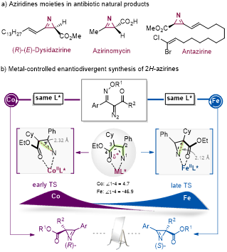 刘小华教授和冯小明教授团队取得重要进展,利用手性双氮氧配体(冯氏配体)和廉价金属(铁和钴)为催化剂,成功开发出首例金属调控的分子内串联重排对映发散性合成策略,高效构建了一系列2H-azirines及其衍生物。通过简单的改变金属从钴到铁,无论在光照还是加热条件下,都能够表现出优异的手性翻转催化功能。其中钴催化的反应即使在万分之五的极低催化剂负载下也具有很高的催化效率。结合机理实验和密度泛函理论计算,揭示了钴和铁独特的电子性质调节了关键中间体的构像和二面角,从而实现了手性翻转。该研究展现了手性双氮氧/金属配合物在发散性合成中的巨大潜力,也为高张力氮杂环化合物的精准构筑开辟了新路径。