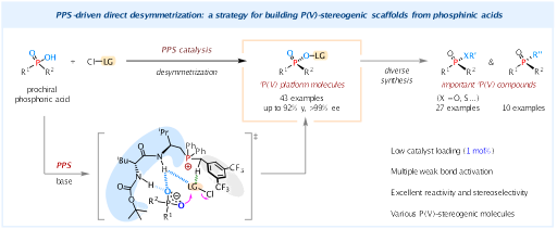 王天利教授团队提出"去对称化-衍生化"双模块策略:利用其发展的仿生手性肽季鏻盐催化剂,成功实现次磷酸类分子的精准对映选择性去对称化,高效构建系列手性P(V)-平台分子(图1)。值得注意的是,这些手性P(V)砌块可通过立体专一性转化精准合成多类高值的手性P(V)分子,为结构多样性的手性P(V)化合物提供了模块化合成新途径。