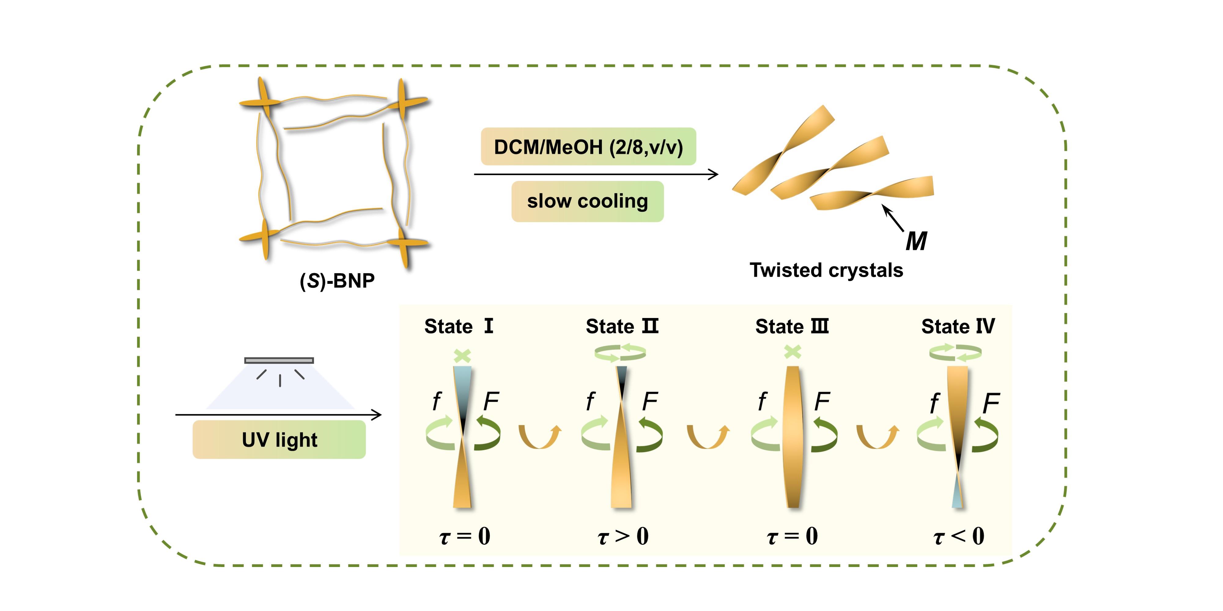 于珊珊团队通过缓慢冷却的方案制备具有宏观手性结构的螺旋组装体,实现了紫外光照射下的微米尺度连续原位旋转运动。团队通过精心设计联萘-偶氮苯分子,并进一步精确调控其自组装条件,包括溶剂的浓度、冷却速率、溶剂类型和极性等,成功制备出宽数十微米、长数百微米的宏观同手性螺旋组装体(BNP twist)。组装体在紫外光照下展现出围绕固定轴的连续原位旋转运动,其速度可由光强和尺寸调控,方向受螺旋几何结构导致的光照非对称性影响。该研究在实现微纳尺度的复杂持续运动上迈出了重要的一步,为精密光机械元件、自适应机器人和可持续能源收集器件的设计提供了一种新的思路。