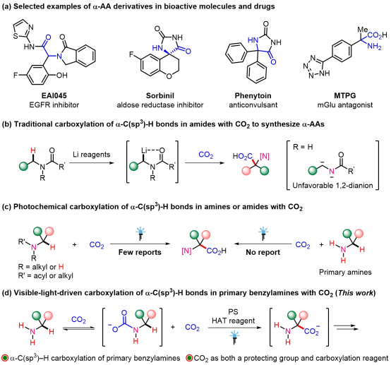 二氧化碳(CO2)作为一种无毒、廉价且可再生的理想C1合成子,其催化转化制备高附加值羧酸化学品,具有重要意义。另一方面,α-氨基酸不仅是构成多肽和蛋白质的基本单元,其结构也广泛存在于众多天然产物、生物活性分子和药物分子中,其合成具有重要价值且备受关注。目前,利用CO2作为羧基源合成α-氨基酸的方法中,往往需要使用当量金属试剂、高压CO2或预官能团化的胺类底物。相较而言,伯胺氮原子α-C(sp3)–H直接羧基化合成该类氨基酸则具有更高的原子经济性和步骤经济性,更符合绿色化学发展理念。然而,伯胺氧化电势相对较高且易过度氧化,其α-C(sp3)–H直接羧基化尽管极具吸引力,但也面临极大的挑战。因此,亟待开发温和条件下CO2参与的伯胺α-C(sp3)–H羧基化反应,合成高附加值的α-氨基酸。