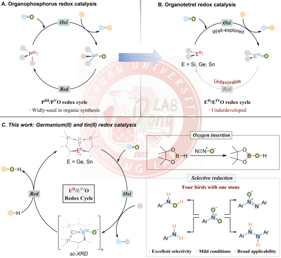 董召文课题组利用碳二膦烷配体稳定的二价锗、锡试剂,首次成功构筑了基于EII/EIVO (E = Sn, Ge)氧化还原循环的新型催化模式。该体系不仅能高效催化活化一氧化二氮(N2O),更能精准调控硝基芳烃的还原路径,通过简单改变反应条件,即可从同一硝基底物高选择性地合成胺、羟胺、氧化偶氮化合物或肼四类不同的产物,实现了“一石四鸟”的化学多样性合成。该研究揭示了重十四族元素独特的催化机制,为利用主族元素替代贵金属催化剂实现复杂精细合成提供了关键范例和理论指导。