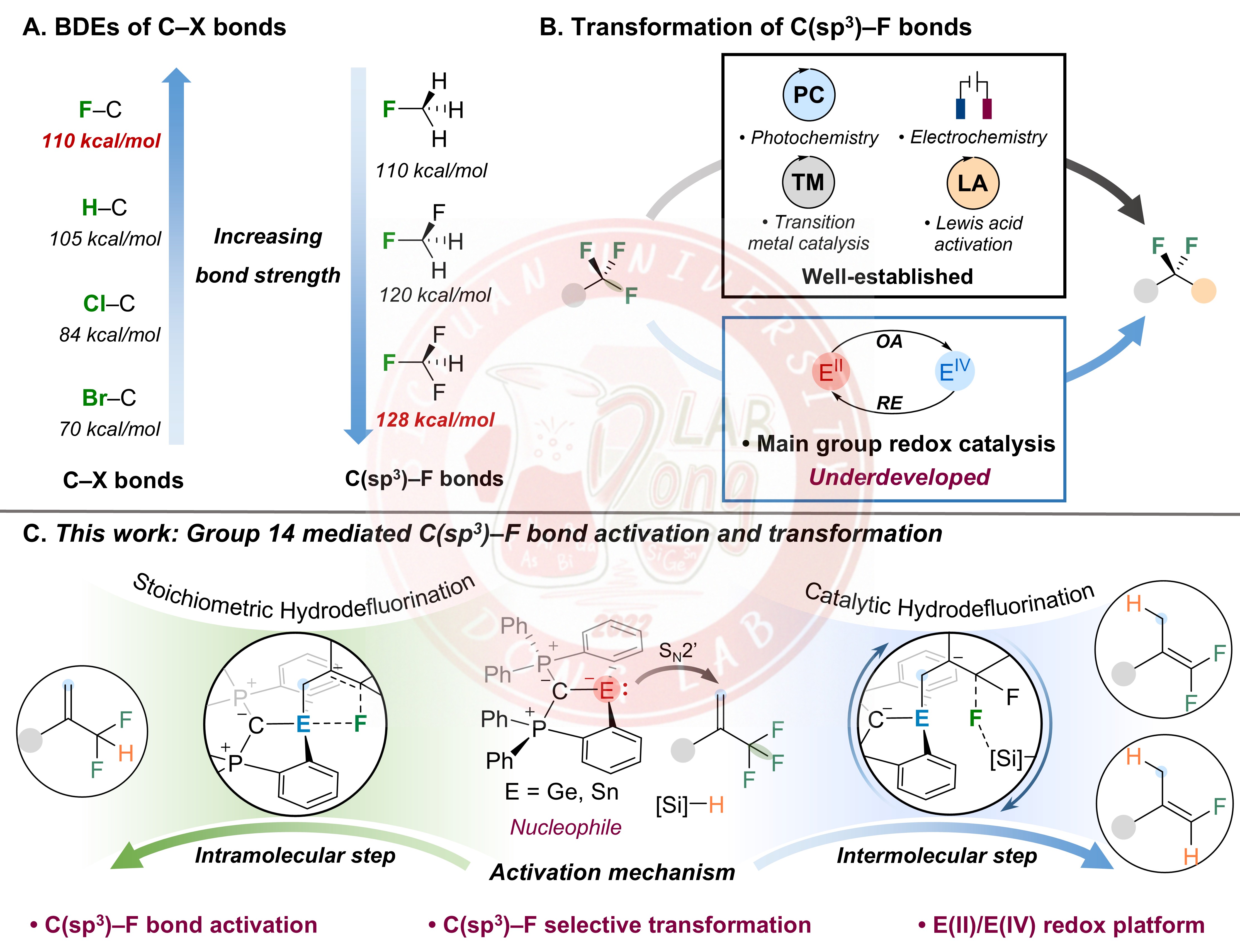 董召文课题组聚焦于具有准金属特性的低价重十四族元素试剂的精准合成与催化性能研究。围绕“低价锗、锡变价催化”这一关键科学问题,通过创新配体设计与合成策略,成功开发了多种结构新颖的低价锗、锡试剂,并率先构建了基于Sn(II)/Sn(IV)、Ge(II)/Ge(IV)及Ge(II)/Ge(III)/Ge(IV)变价循环的主族催化新体系(Angew. Chem. Int. Ed. 2026, e7786614; J. Am. Chem. Soc. 2025, 36752; Angew. Chem. Int. Ed. 2025, 64, e202515638; Nat. Commun. 2024, 15, 9849; JACS Au 2025, 5, 1289; Inorg. Chem. 2026, 65, 2060)。然而,利用低价主族化合物实现C(sp3)−F键选择性催化活化至今仍未实现突破,仍是该领域亟待解决的重要科学难题。