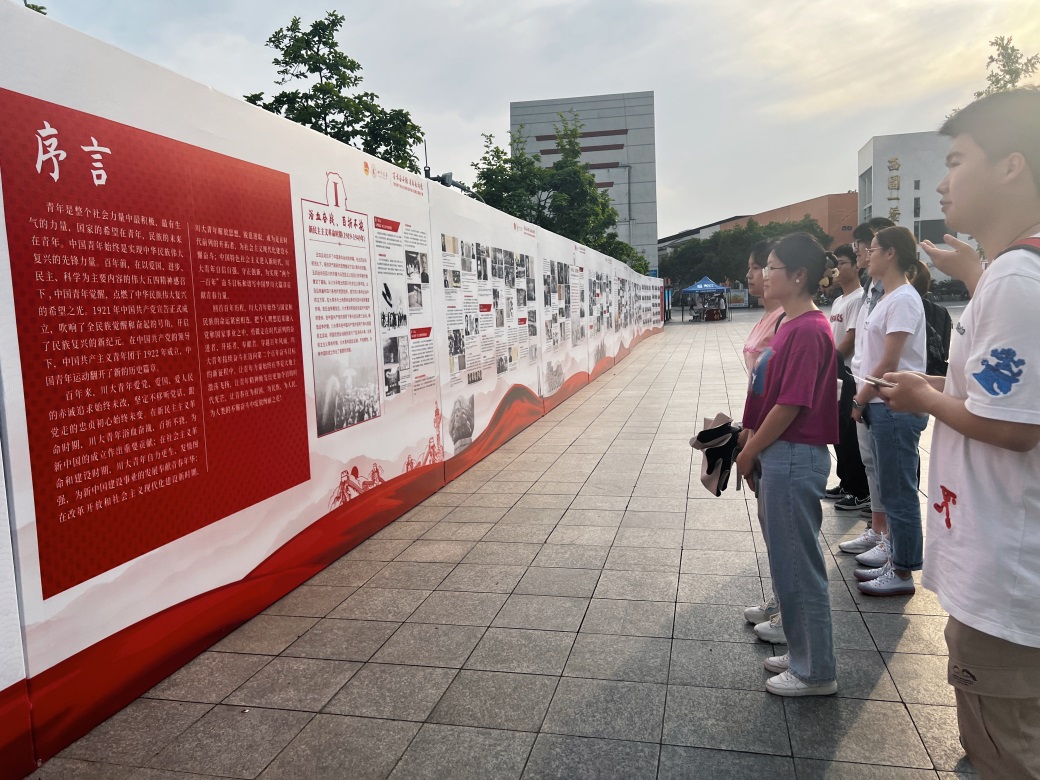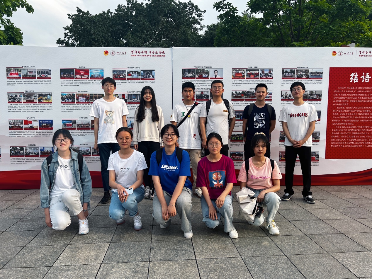 2020级本科学生党支部开展主题党日活动,参观学习了江安校区青春广场摆放的“百年奋斗路 青春永向党——党领导下的川大青年百年奋斗历程主题图片展”。
