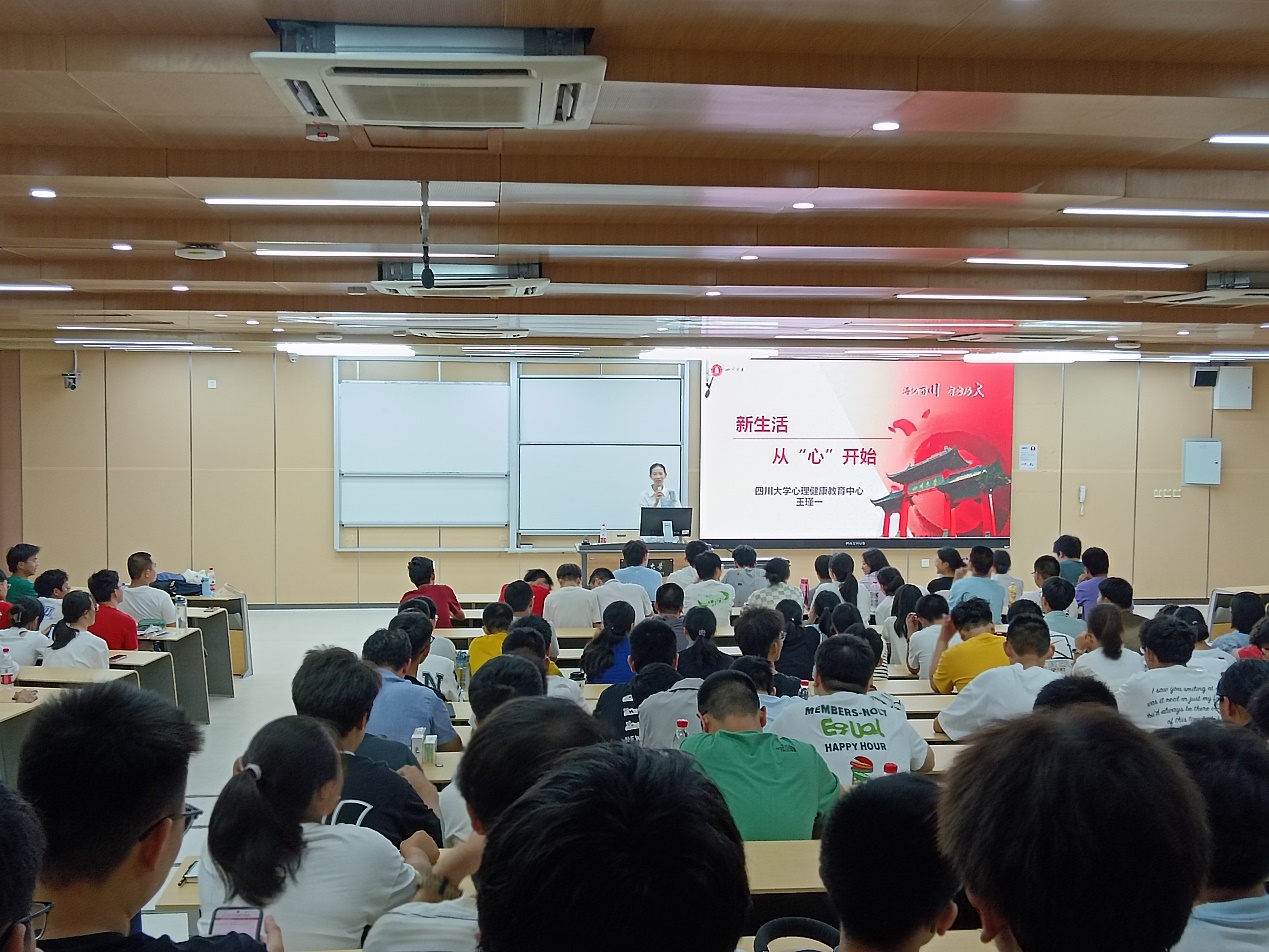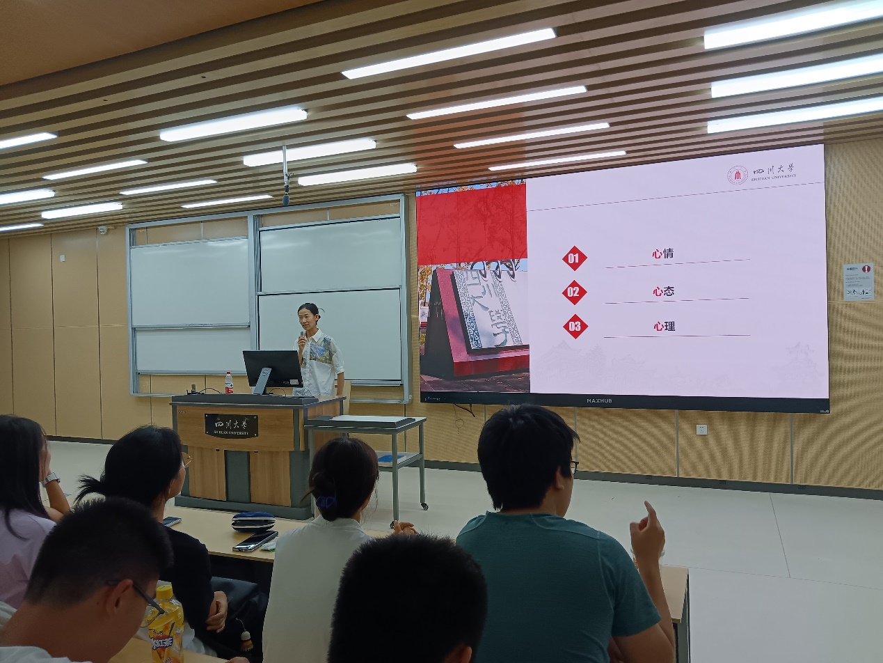 的第一印象,与同学们进行了亲切的交流互动;然后提出了学生应当注重心情,心态,心理方面的诸多内容,与同学们就初入川大的心情做了交流。