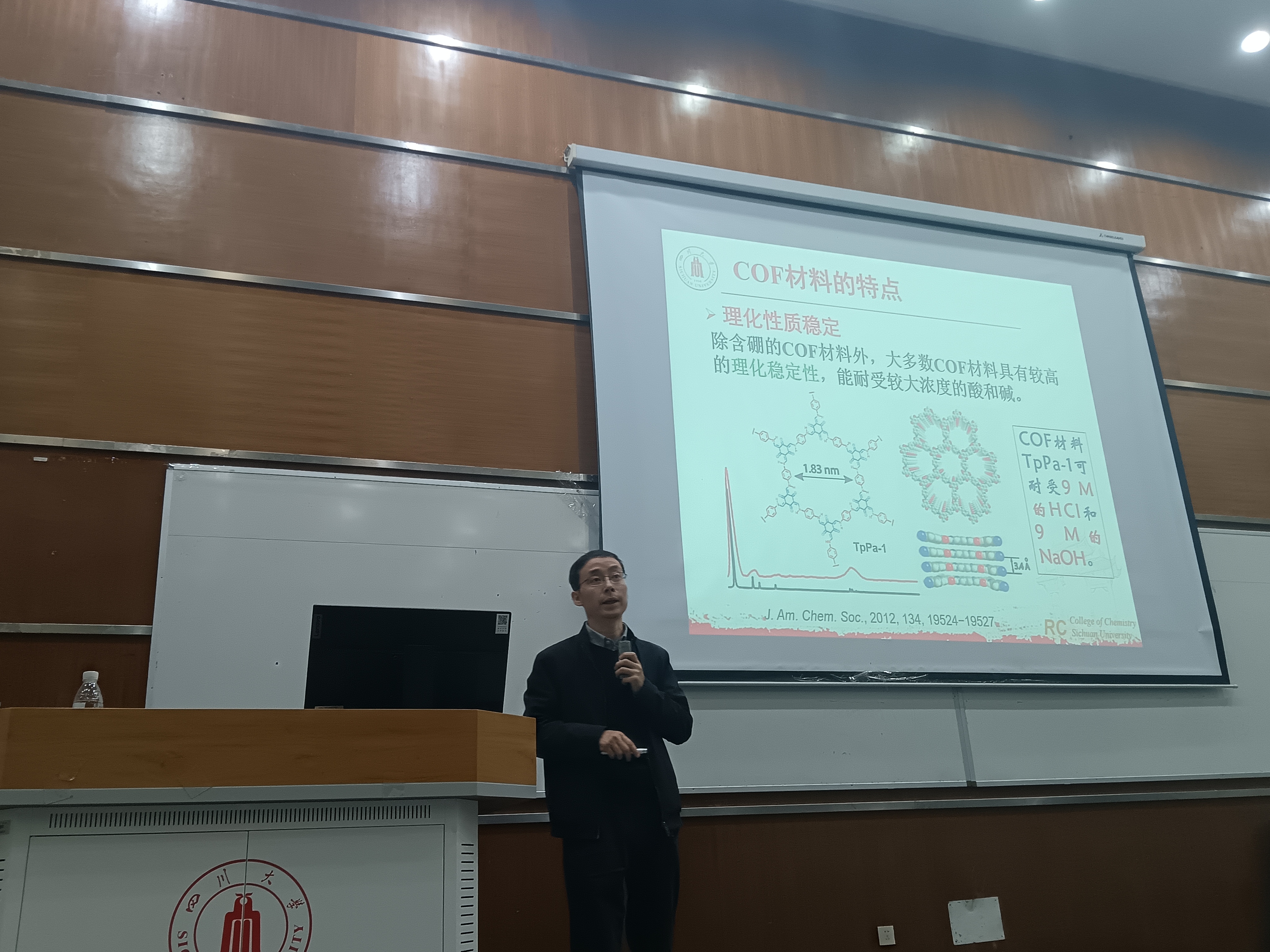 随后,马老师对同学们提出了两点建议——明确目标,不断进取;坚定信心,脚踏实地。并希望同学们能将创新应用于学习和科研过程中。接下来,马老师结合自身的科研经历,介绍了课题组首次将COF材料应用于核科学领域的创新性突破,以及与之相关的一系列创新研究。
