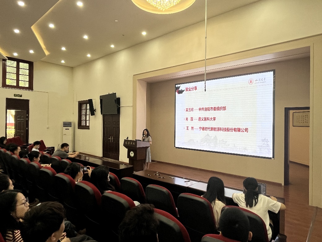 应届毕业生分享各自的毕业去向和就职经验。这三位同学选择了不同的职业,都在求职过程中积累了丰富的经验,能帮助在座的研究生们更好地了解不同职业领域的特点和要求,从而做出更明智的职业选择。2021级硕士研究生吴玉珂从公考课程学习、公考时间安排、公考面试技巧分享了自己的考公经验,并为大家制定了详细的学习计划。