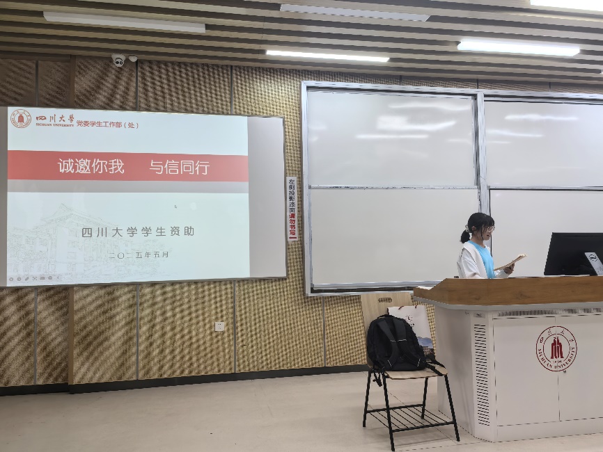 2024级阳光资助宣传员江万奇和蒲杰主讲,对诚信在资助中的重要性、诚信有关的典型问题、征信知识普及等方面进行了细致地宣讲。其对诚信的价值和重要性做了深刻的阐述,宣讲条理清晰,富有感染力,在座的同学都深有感触,起到了树立学生诚信意识,规范学生诚信做人的目的。