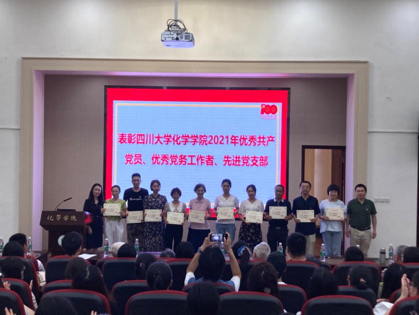庆祝建党100周年专题党课暨“七一”表彰大会在化学馆321报告厅隆重举行。学院党政领导、党委委员、纪委委员、专职组织员、支部书记及支委、民主党派代表、离退休党员代表、在职教师党员代表、学生党员代表及全体预备党员参加了本次大会。大会由院党委书记谢均同志主持,大会在齐唱《中华人民共和国国歌》声中拉开帷幕。