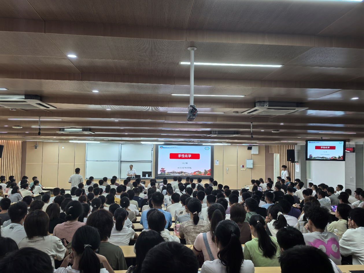 随后,冯小明院士向大家介绍了他的研究领域,通过生活中的广泛事例表明手性化学研究的重要性,并讲述了他通过持续努力使“不对称催化”在中国实现从无到有的突破。冯小明院士通过讲述他的科研成就及其与全球学者的经验交流经历,鼓励同学们要深入钻研,努力学习,表明成功奠定在努力的基础之上,需要目标和理想的引领,并且提出创新人才的内涵与努力方向。