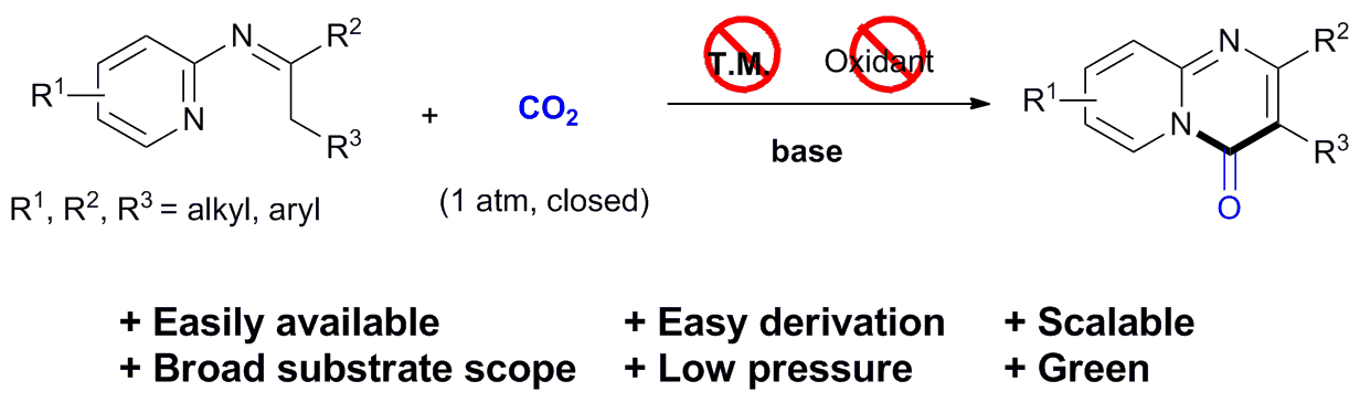 74. Z. Zhang,*‡ X.-Y. Zhou,‡ J.-G. Wu, L. Song, D.-G. Yu*, Transition-Metal-Free Lactamization of C(sp3)—H Bonds with CO2: Facile Generation of Pyrido[1,2-a]pyrimidin-4-ones. Green Chem. 2020, 22, 28. (‡ Equal contribution)