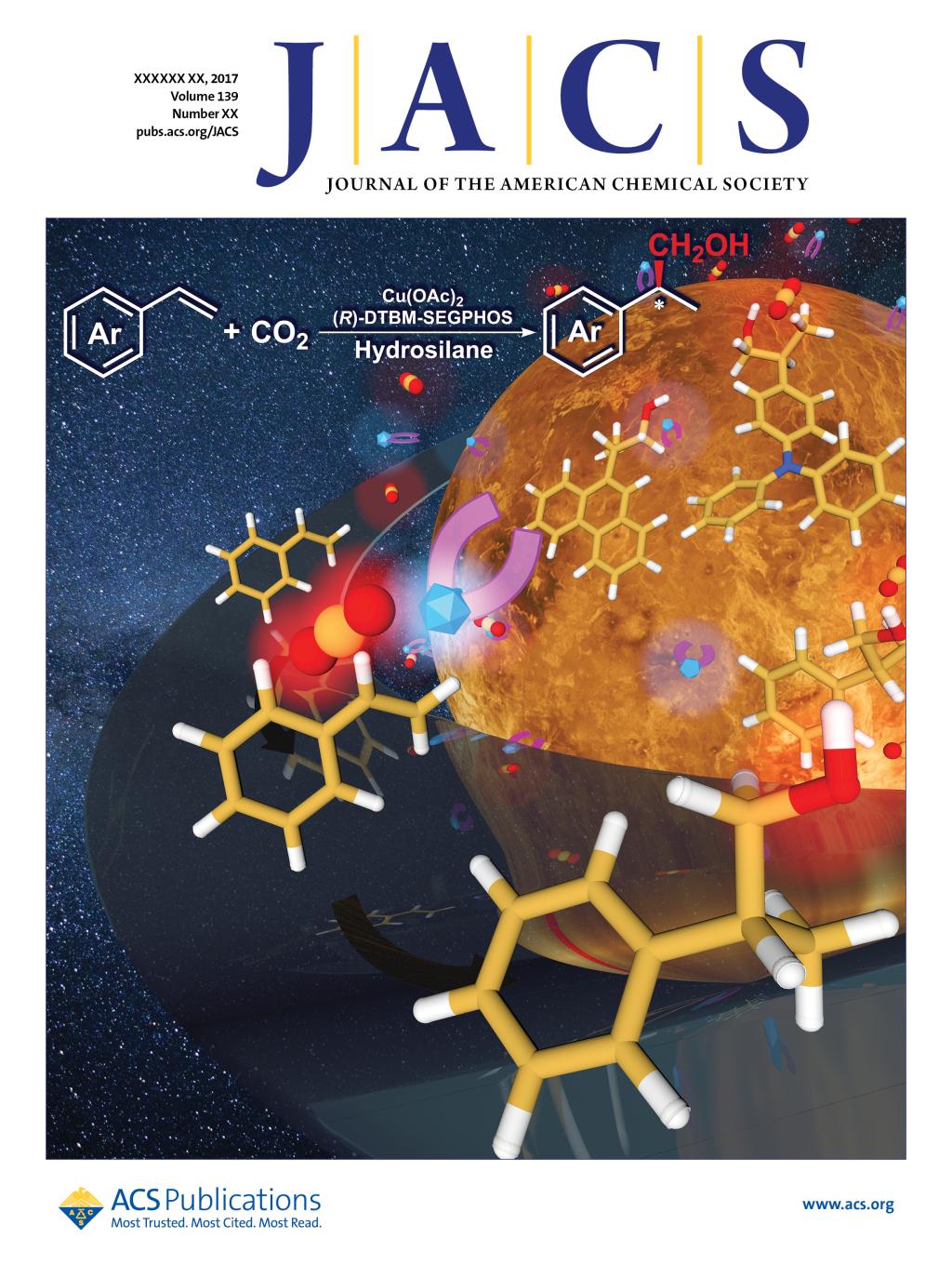 98. Y.-Y. Gui,† N. Hu,† X.-W. Chen, L.-L. Liao, T. Ju, J.-H. Ye, Z. Zhang, J. Li, D.-G. Yu*, Highly Regio- and Enantioselective Copper-Catalyzed Reductive Hydroxymethylation of Styrenes and 1,3-Dienes with CO2. J. Am. Chem. Soc. 2017, 139, 17011. († Equal contribution. Cover. Top 4 most read JACS papers in November, 2017. Highlighted by Synfacts 2018, 14, 0177, CJOC, X-MOL, OPR&D and Organic Chemistry Portal)