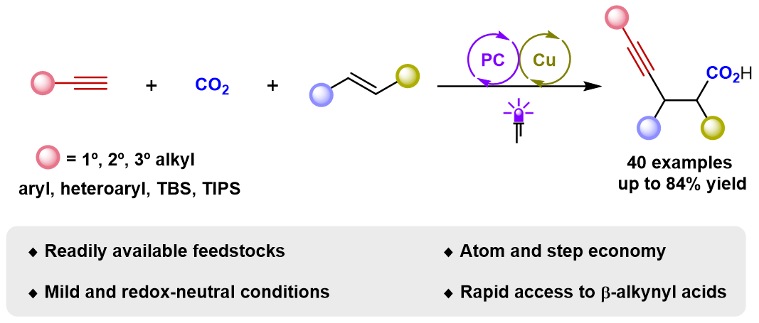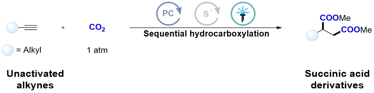 1. W. Wang,† S.-S. Yan,† Y. Liu, J.-S. Zhu, J.-W. Yang, J.-C. Xu, Y.-Y. Tao, J.-C. Li, L. Song, J.-H. Ye,* D.-G. Yu*, Photocatalytic 1,2-Dicarboxylation of Unactivated Alkynes with CO2. J. Am. Chem. Soc. 2025. († Equal contribution.)