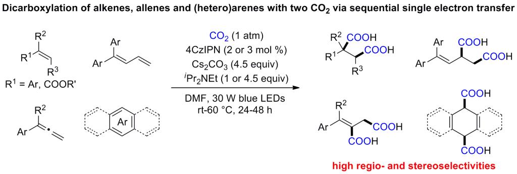 58. T. Ju, Y.-Q. Zhou, K.-G. Cao, Q. Fu, J.-H. Ye, G.-Q. Sun, X.-F. Liu, L. Chen, L.-L. Liao, D.-G. Yu*, Dicarboxylation of alkenes, allenes, and (hetero)arenes with CO2 via visible-light photoredox catalysis. Nat. Catal. 2021, 4, 304–311.