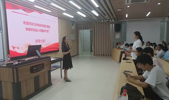 农学院学生,为新中国成立做出杰出贡献的江姐的英雄事迹,展示了一名共产党员的崇高品格及家国情怀。最后介绍了发展党员的基本要求和程序,鼓励同学们积极向党组织靠拢,也亲切地解答了同学关于入党相关事项的问题。